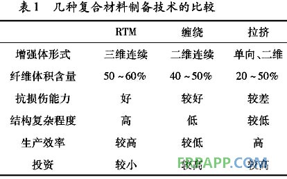 RTM是樹脂傳遞模塑工藝的縮寫(Resin TransferMolding),一般指在模具的型腔里預(yù)先鋪放增強材料,合模后,在一定的溫度和壓力下將樹脂注入模具,浸漬織物增強體并固化,最后脫模得到制品的一種工藝。RTM成型工藝是從濕法鋪層和注塑工藝演衍生出來的一種新的復(fù)合材料成型工藝,是目前航天航空先進復(fù)合材料的發(fā)展方向之一。運用于航天產(chǎn)品的RTM成型工藝制造的復(fù)合材料,其使用的纖維增強體采用編織成型,產(chǎn)品價格較高,但隨著國內(nèi)多家企業(yè)對編織技術(shù)、編織機械的大力發(fā)展,編織體的價格已大幅下降,為RTM成型技術(shù)在航天產(chǎn)品的廣泛應(yīng)用提供了可能。RTM技術(shù)是一種適宜多品種、中小批量、高質(zhì)量復(fù)合材料生產(chǎn)的成型技術(shù),近年來得到聲迅速發(fā)展。美國國家宇航局對RTM給予了高度重視,并認為該技術(shù)是制造結(jié)構(gòu)材料的一種成本低、效益好的方法。RTM與纏繞、拉擠等幾種復(fù)合材料制備技術(shù)的綜合比較見表1。從表1可以看出,RTM在這幾項低成本制造技術(shù)中的綜合優(yōu)勢是明顯的。